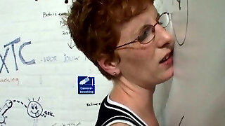 Ugly four eyed woman deep throats the dick through the gloryhole