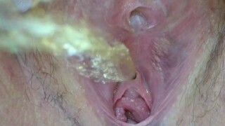 Wife let me look at her pissing gaping pussy, for which she get a huge jizm load inside. Close-up