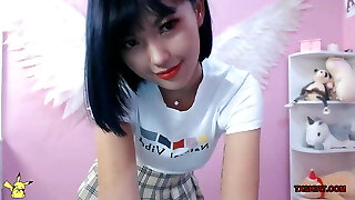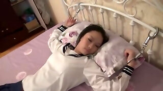Asian inexperienced schoolgirl with long ponytail, sensitive constitution, very effortless to orgasm